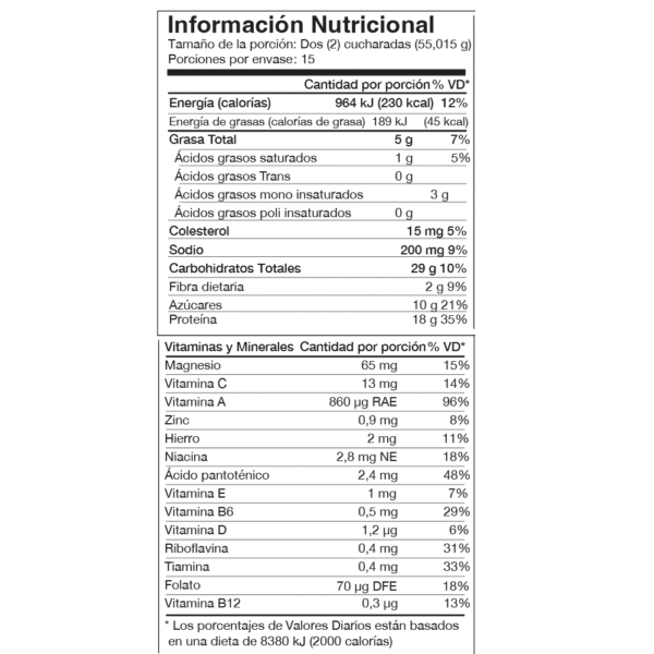 Con solo 120 calorías por porción, su composición incluye saborizantes, edulcorantes y colorantes naturales, ofreciendo un agradable sabor a vainilla para una experiencia deliciosa y saludable