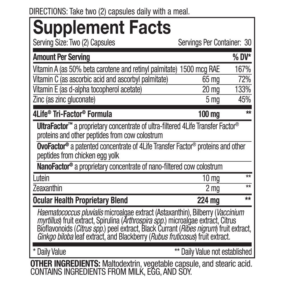 Elaborado para no perder detalle. 4Life Transfer Factor Vista ofrece respaldo específico para el desempeño visual y la salud ocular para que no pierdas cada pequeño detalle que le da belleza a la vida. Vista contiene la marca de luteína más recomendada por los médicos, la cual provee una protección crucial en el área de la mácula ocular y ofrece beneficios antioxidantes. Otros antioxidantes importantes como los extractos de mirtilo y grosella negra respaldan la agudeza visual saludable. Vista también contiene 4Life Transfer Factor para educar y mejorar el sistema inmunitario, y vitaminas A, C y E para respaldo adicional contra los radicales libres. Toma dos (2) cápsulas diarias que te ofrecen nutrientes cruciales para una salud ocular óptima. 4Life Transfer Factor Vista viene en cápsulas de origen vegetal